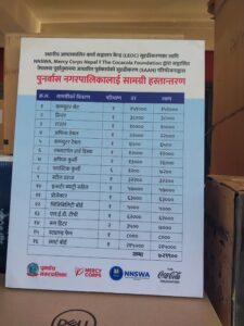 कञ्चनपुरः कञ्चनपुरको पुनर्वास नगरपालिकालाई स्थानीय आपतकालीन कार्य सञ्चालन केन्द्र (एलईओसी) सुदृढीकरणका लागि सामग्री हस्तान्तरण गरिएको छ। नेपाल राष्ट्रिय समाज कल्याण संघ (एनएनएसडब्ल्यूए) र मर्सिकोर नेपालको साँझेदारी तथा द कोकाकोला फाउण्डेशनको आर्थिक सहयोगमा सञ्चालित नेपालमा पूर्वानुमानमा आधारित पूर्वकार्यको सुदृढीकरण (सान) परियोजनाअन्तर्गत सो सामग्री हस्तान्तरण गरिएको हो।