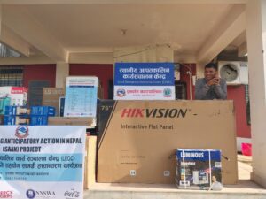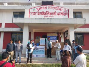 सान परियोजनाका कार्यक्रम संयोजक देवराज बडुले स्थानीय आपतकालिन कार्य सञ्चालन केन्द्र सुदृढीकरणका लागि पुनर्वास नगरपालिकालाई एक थान डेल कम्प्युटर, डिजिटल डिस्प्ले बोर्ड, प्रिन्टर, राउटर, कार्यालय टेबल, एक्सटर्नल हार्ड डिष्क, कार्यालय कुर्ची, प्लाष्टिक कुर्चिहरु, नोटिस बोर्ड, स्टील कपबोर्ड, अफिस प्याकेट, भिजिबिलिटी बोर्ड र स्मार्ट बोर्ड सहित झन्डै रु. ७ लाख ३० हजार बराबरको सामग्री हस्तान्तरण गरिएको जानकारी दिनुभयो